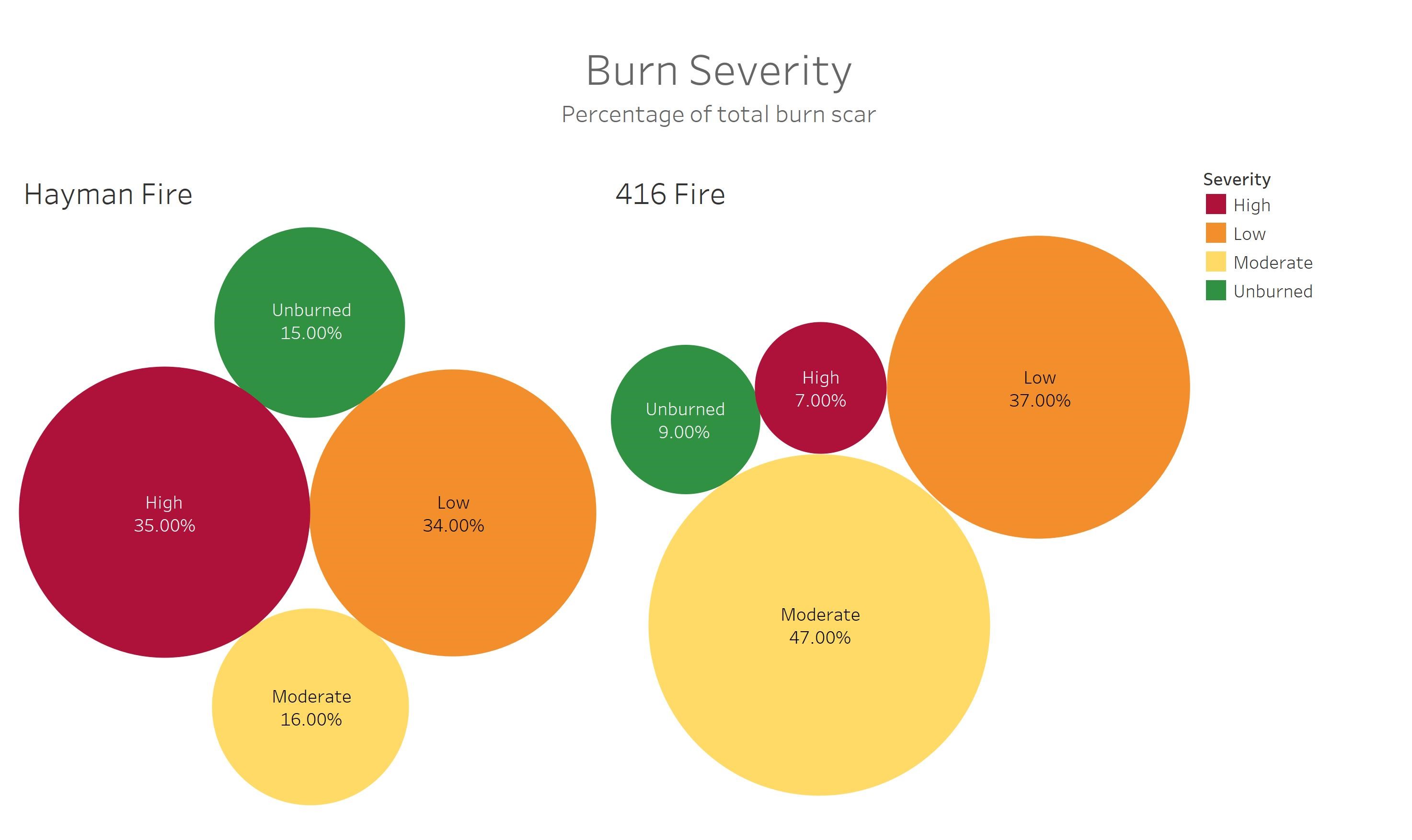 Burn severity may play a huge part in the timing of this recovery. It is generally defined as the loss of or change in organic matter aboveground and belowground. The U.S. Forest Service Burned Area Emergency Response program uses satellite data to determine the loss of vegetation post fire. “Unburned” represents areas with healthy, average vegetation, while “High” indicates a large change in vegetation.